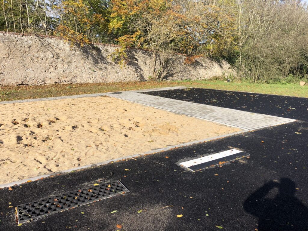 - Eine Sportfläche mit Tartanboden („Gummiplatz“)
