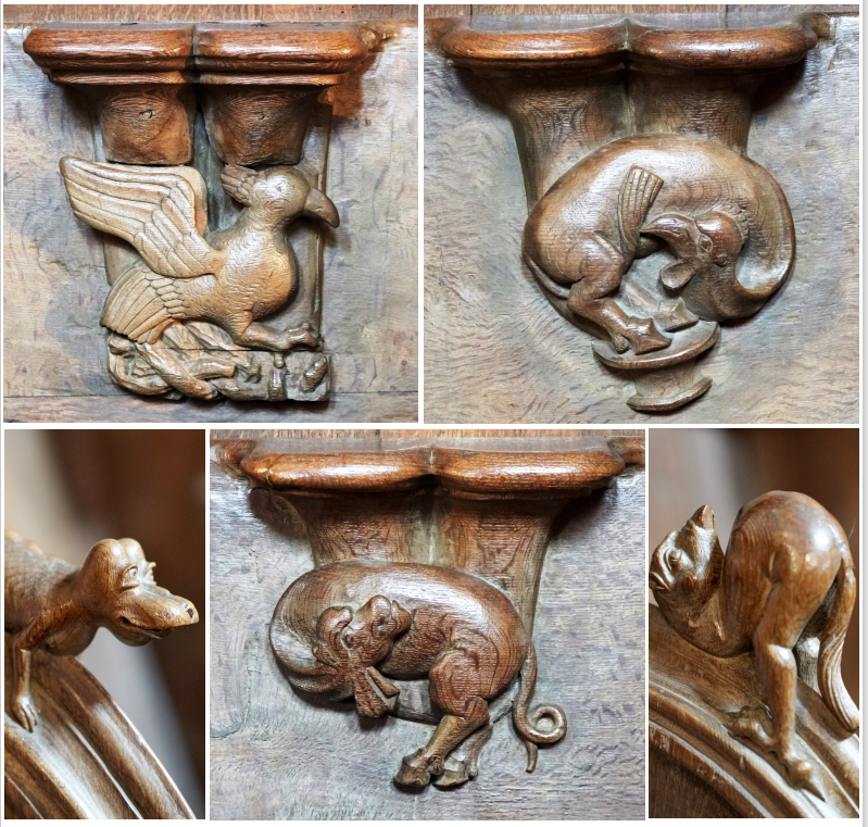 Im Chorgestühl finden sich symbolträchtige Schnitzfiguren . Dargestellt sind Fabelwesen, die zum Teil an die Bildwelt eines Hiernoymus Bosch erinnern.