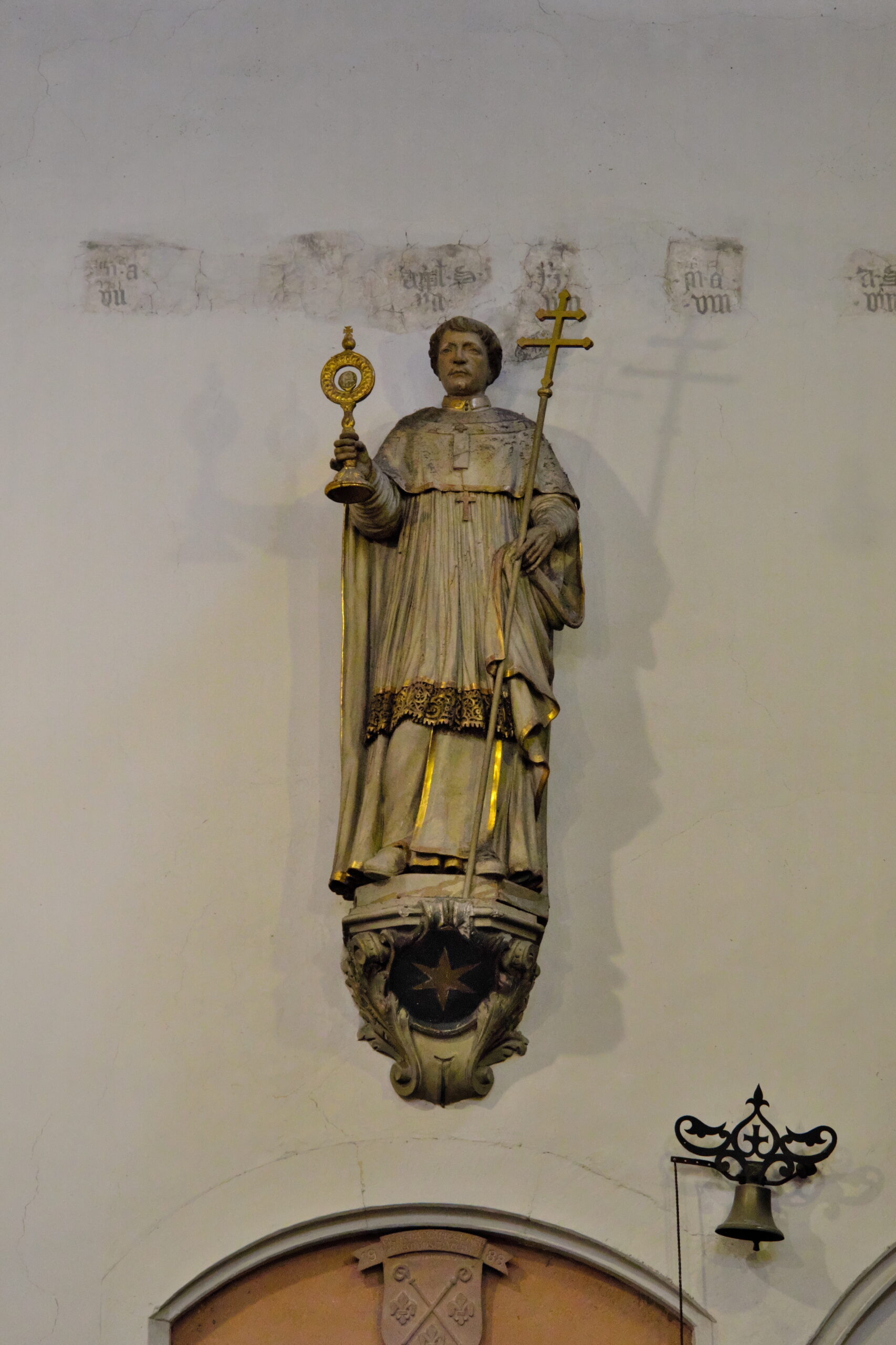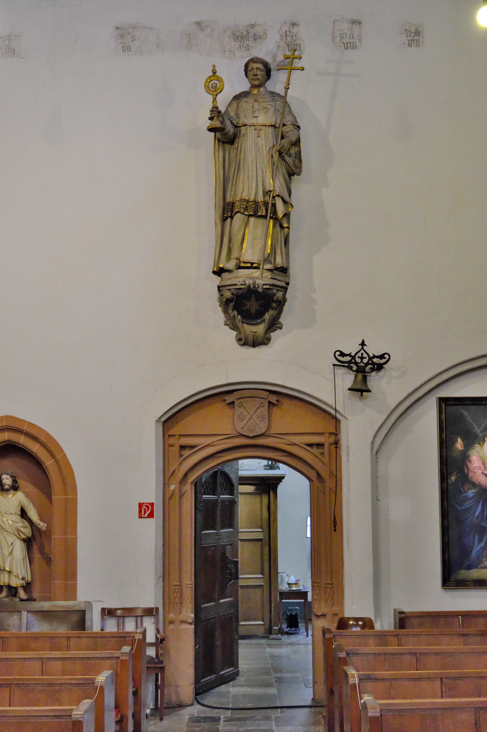 Über dem Eingang zur Sakristei sehen sie Norbert von Xanten mit Patriarchenkreuz und Monstranz.